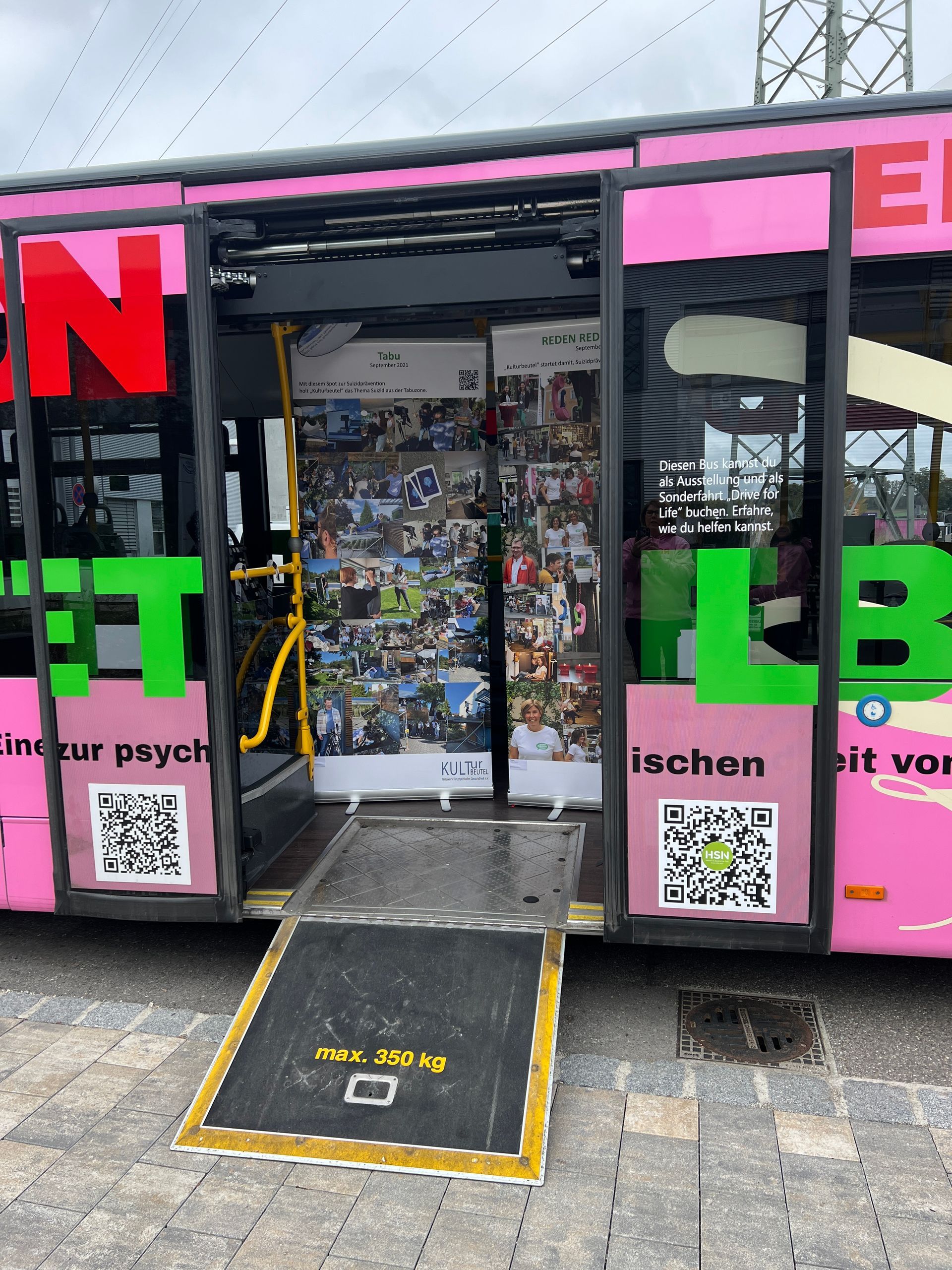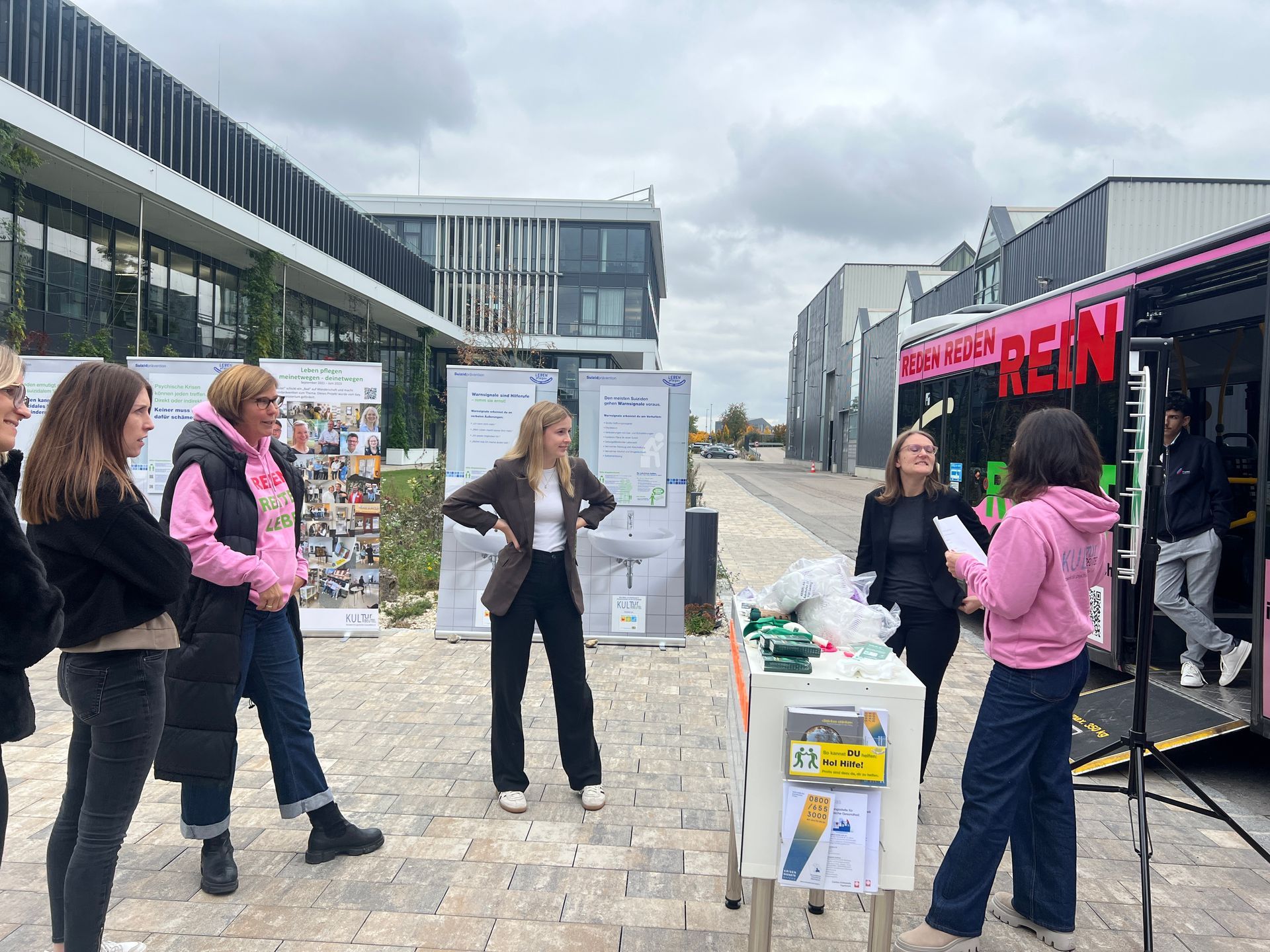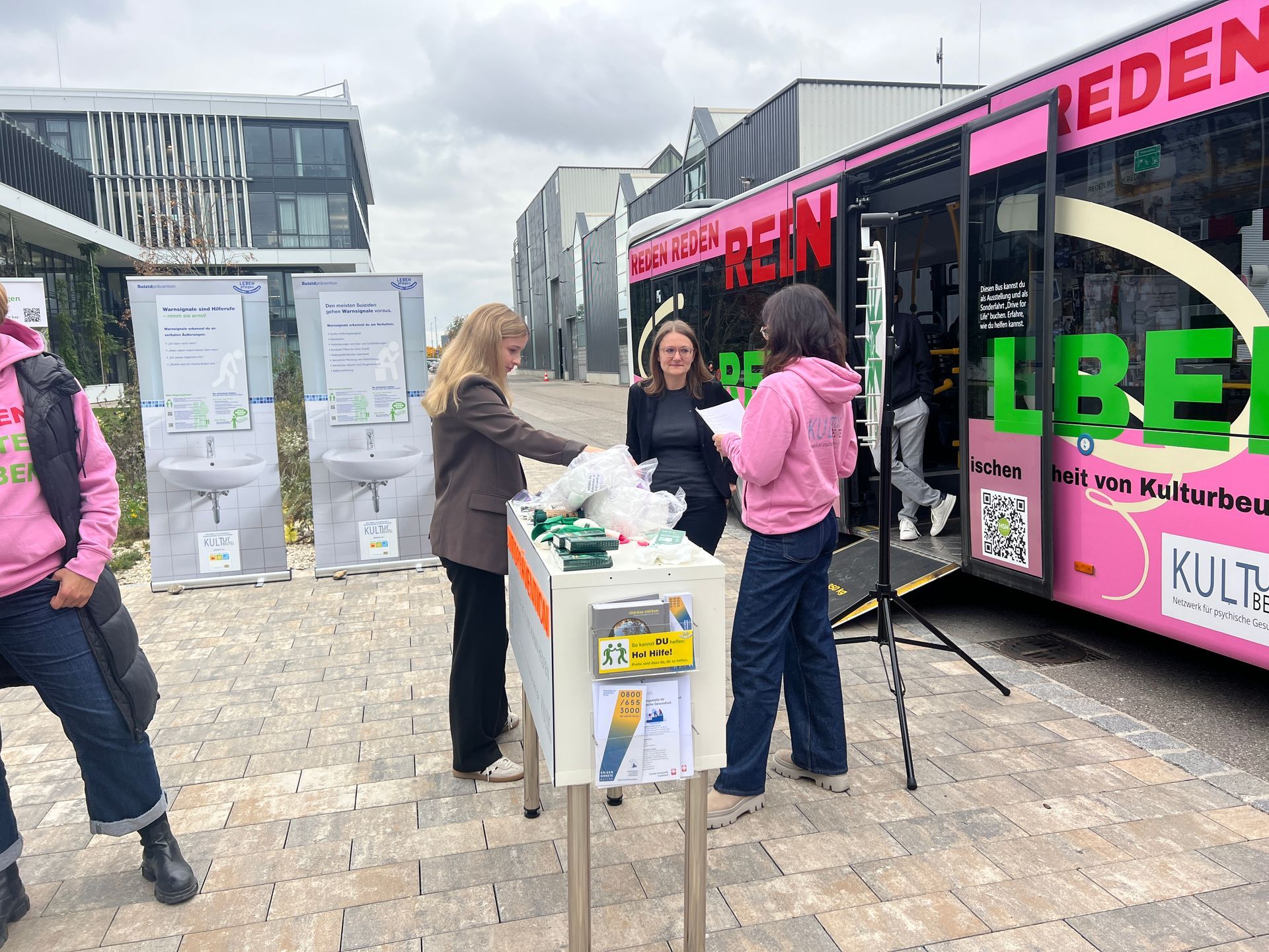 Das Projekt „Hereinspaziert – Drive for Life“ startete im Colab, wo sich zunächst der Verein Kulturbeutel vorstellte. Anschließend erhielten die Gäste spannende Einblicke in wichtige Hilfsangebote wie den Krisendienst und die Telefonseelsorge. Danach ging es mit dem bunt folierten Bus weiter zum sozialpsychiatrischen Dienst, der seine Arbeit präsentierte – und auf der Rückfahrt stieg sogar ein Polizist hinzu, der eindrucksvoll von seiner Erfahrung in der Suizidprävention berichtete.