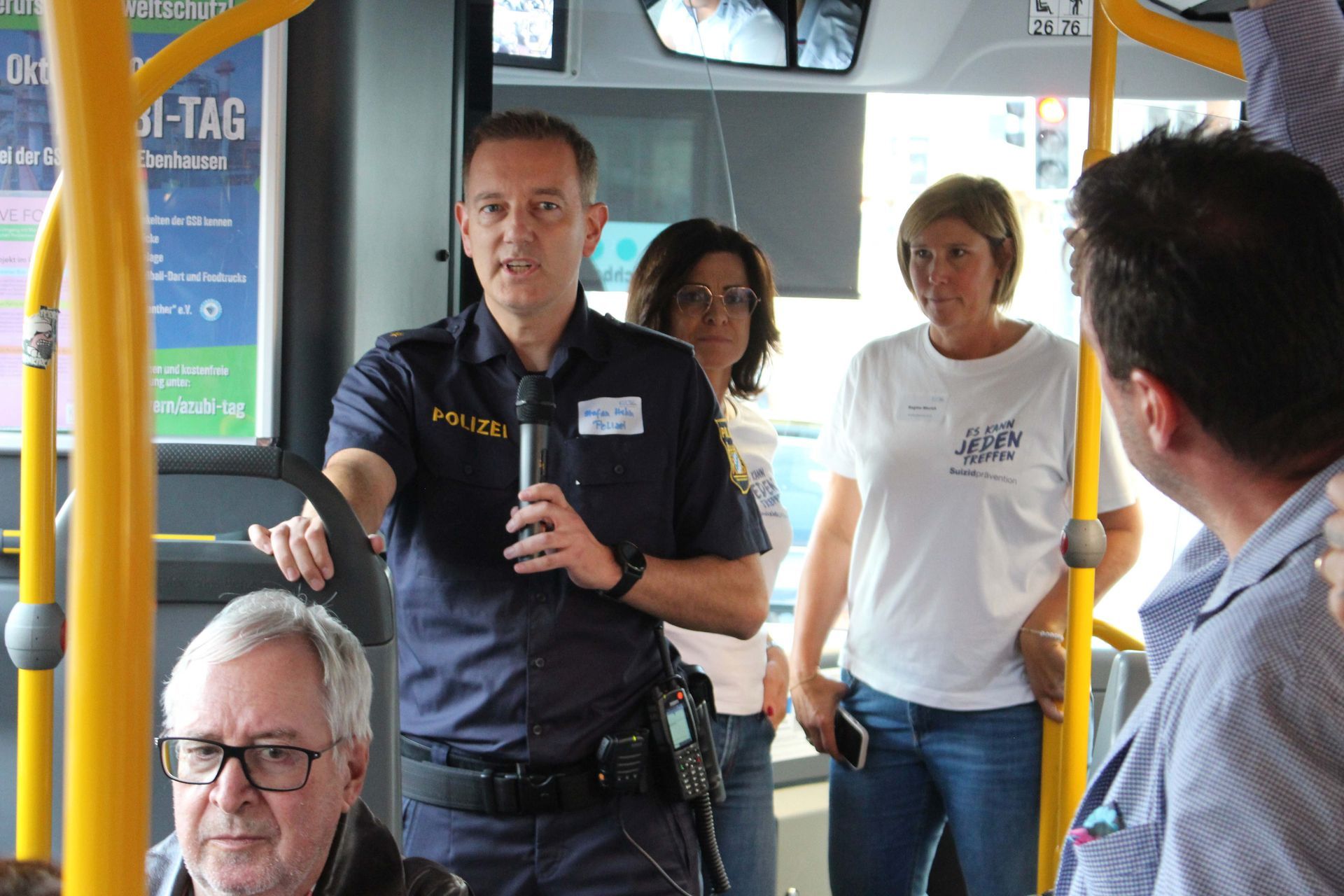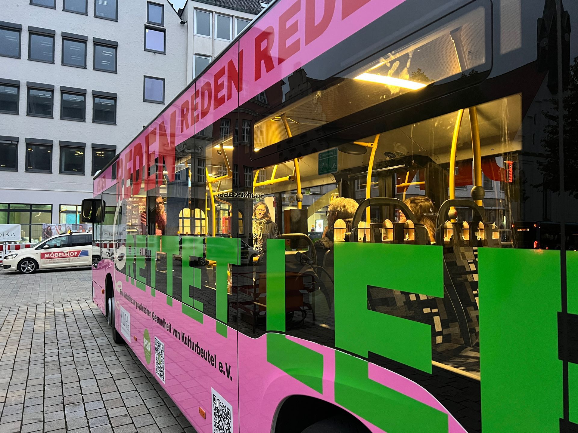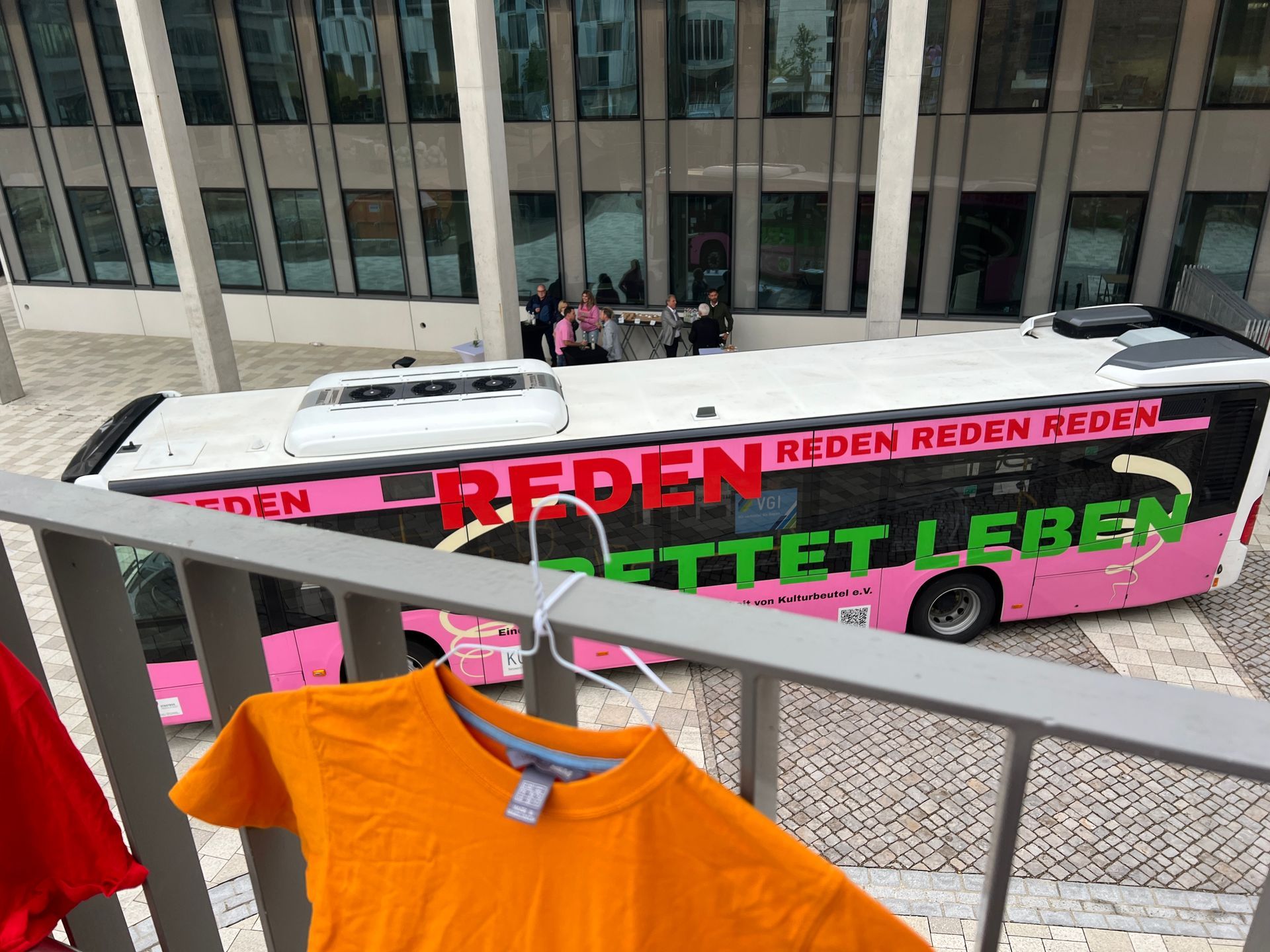 Das Projekt „Hereinspaziert – Drive for Life“ startete im Colab, wo sich zunächst der Verein Kulturbeutel vorstellte. Anschließend erhielten die Gäste spannende Einblicke in wichtige Hilfsangebote wie den Krisendienst und die Telefonseelsorge. Danach ging es mit dem bunt folierten Bus weiter zum sozialpsychiatrischen Dienst, der seine Arbeit präsentierte – und auf der Rückfahrt stieg sogar ein Polizist hinzu, der eindrucksvoll von seiner Erfahrung in der Suizidprävention berichtete.