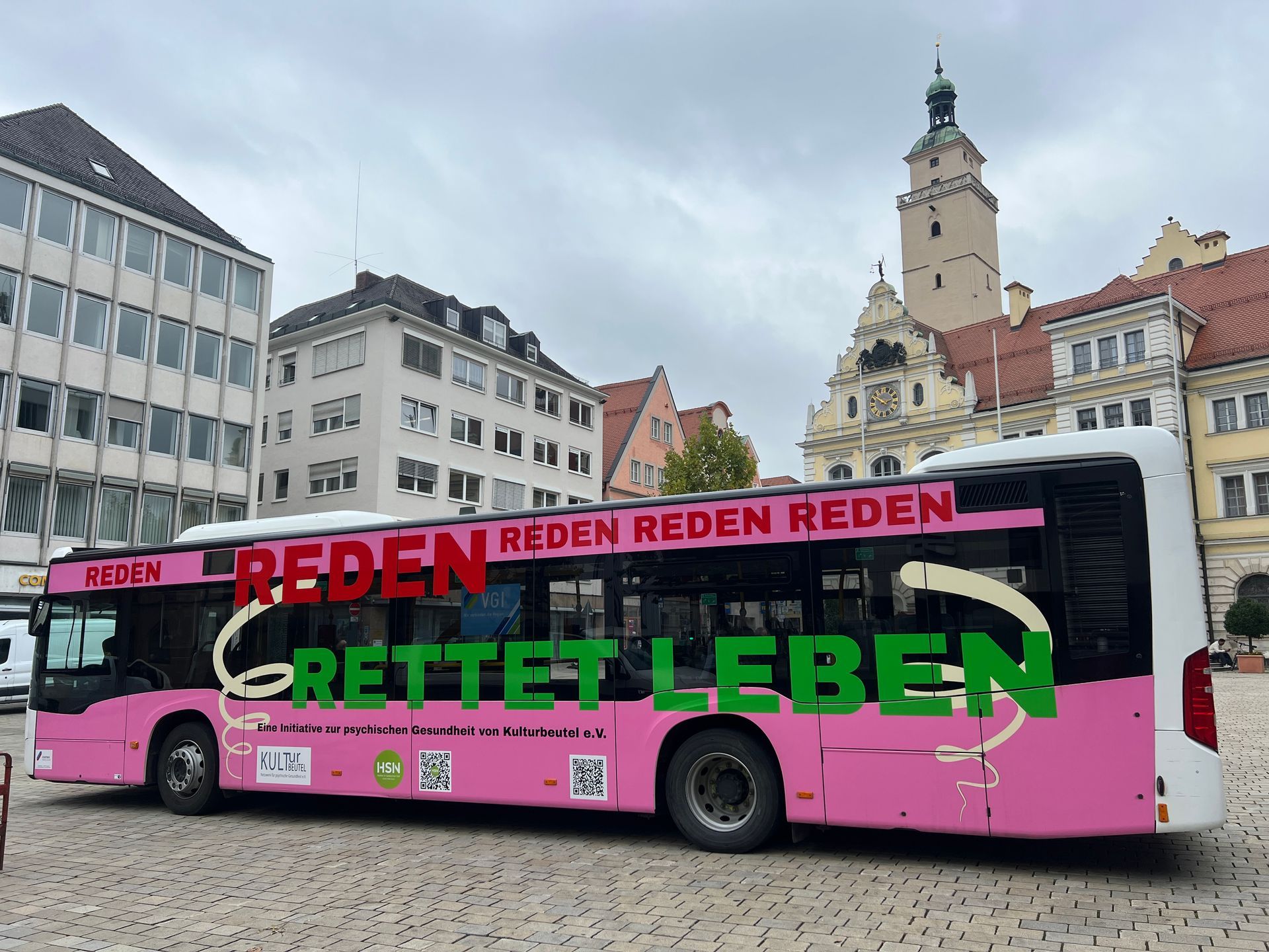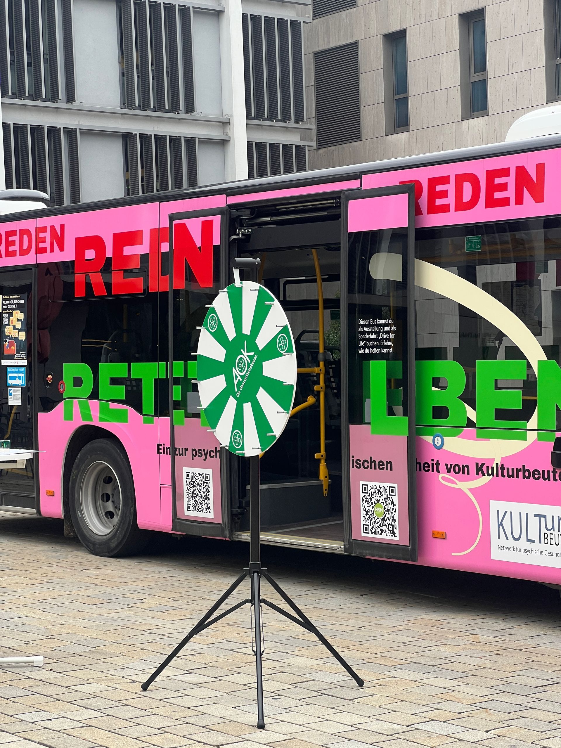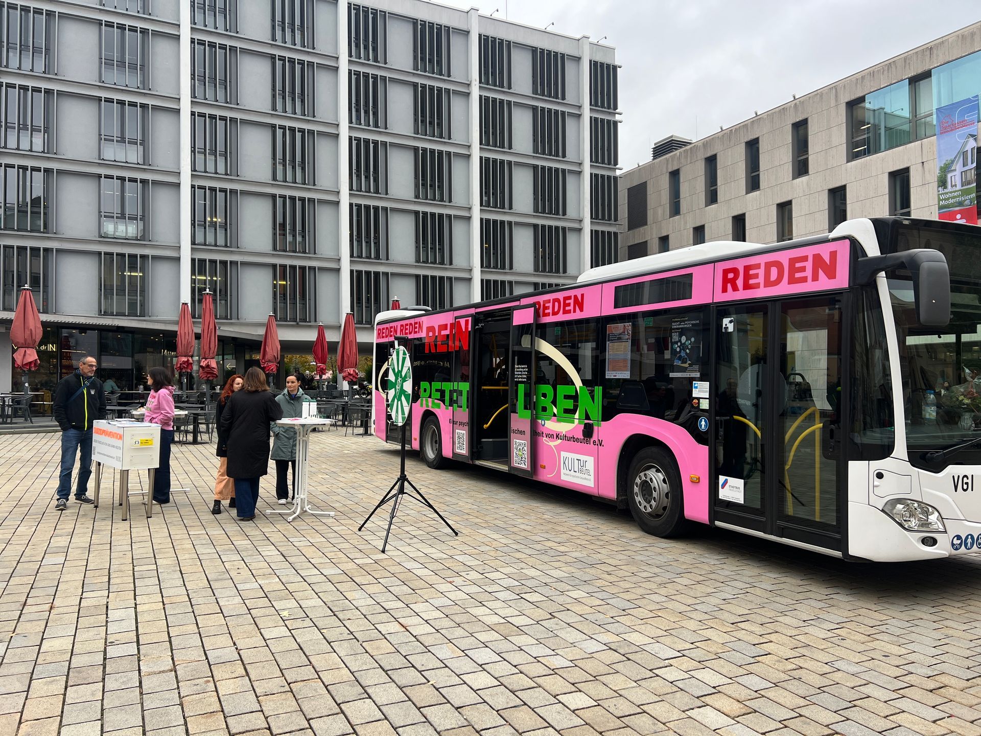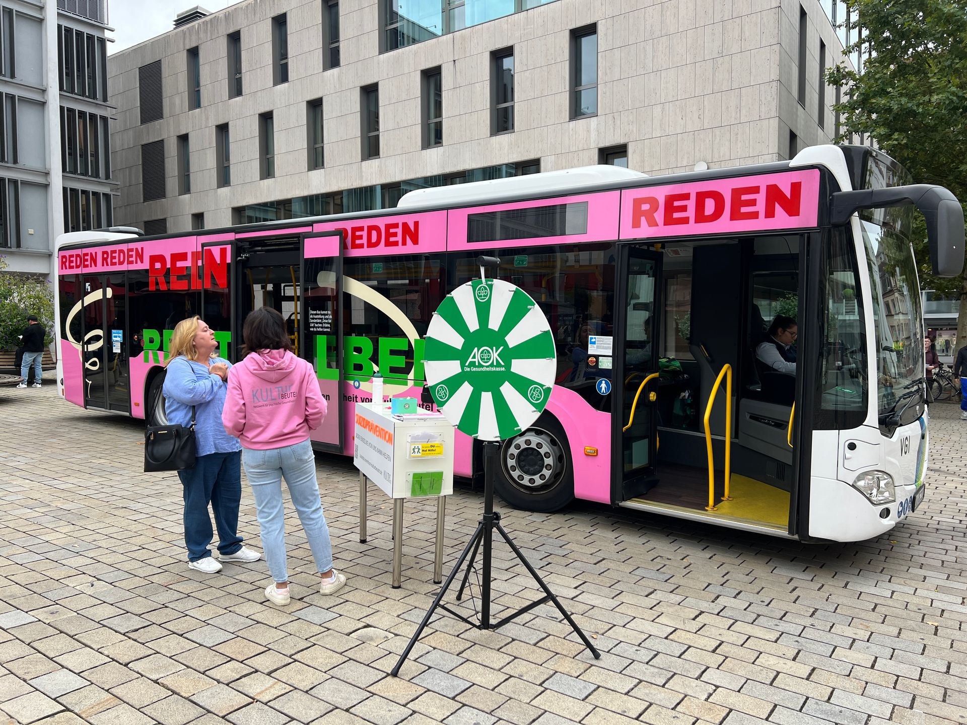 Am 10. Oktober fand auf dem Ingolstädter Rathausplatz im Rahmen der „Woche der seelischen Gesundheit“ eine besondere Aktion statt. Das Jugendamt der Stadt Ingolstadt, Kulturbeutel e.V. und der Stadtjugendring luden gemeinsam zu Austausch und Information ein. Von 15 bis 17 Uhr machte Kulturbeutel mit einem Glücksrad und Gesprächen rund um das Thema psychische Gesundheit auf das Thema aufmerksam, während der Stadtjugendring mit einer Ausstellung zusätzliche Impulse setzte. Den Abschluss bildeten zwei eindrucksvolle Vorträge: Claudia Matterstock sprach über den „Umgang mit Kindern psychisch kranker Eltern“, gefolgt von Johanna Ress, die das Thema weiter vertiefte. So entstand ein offener Raum für Begegnung, Information und Bewusstsein rund um seelische Gesundheit ... alles in unserem Bus.