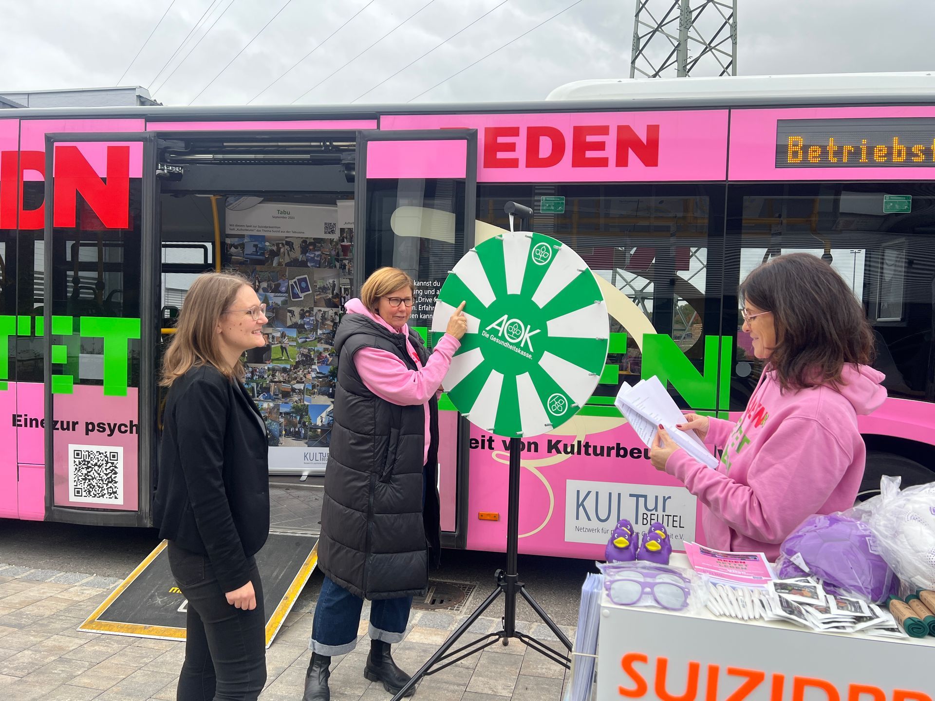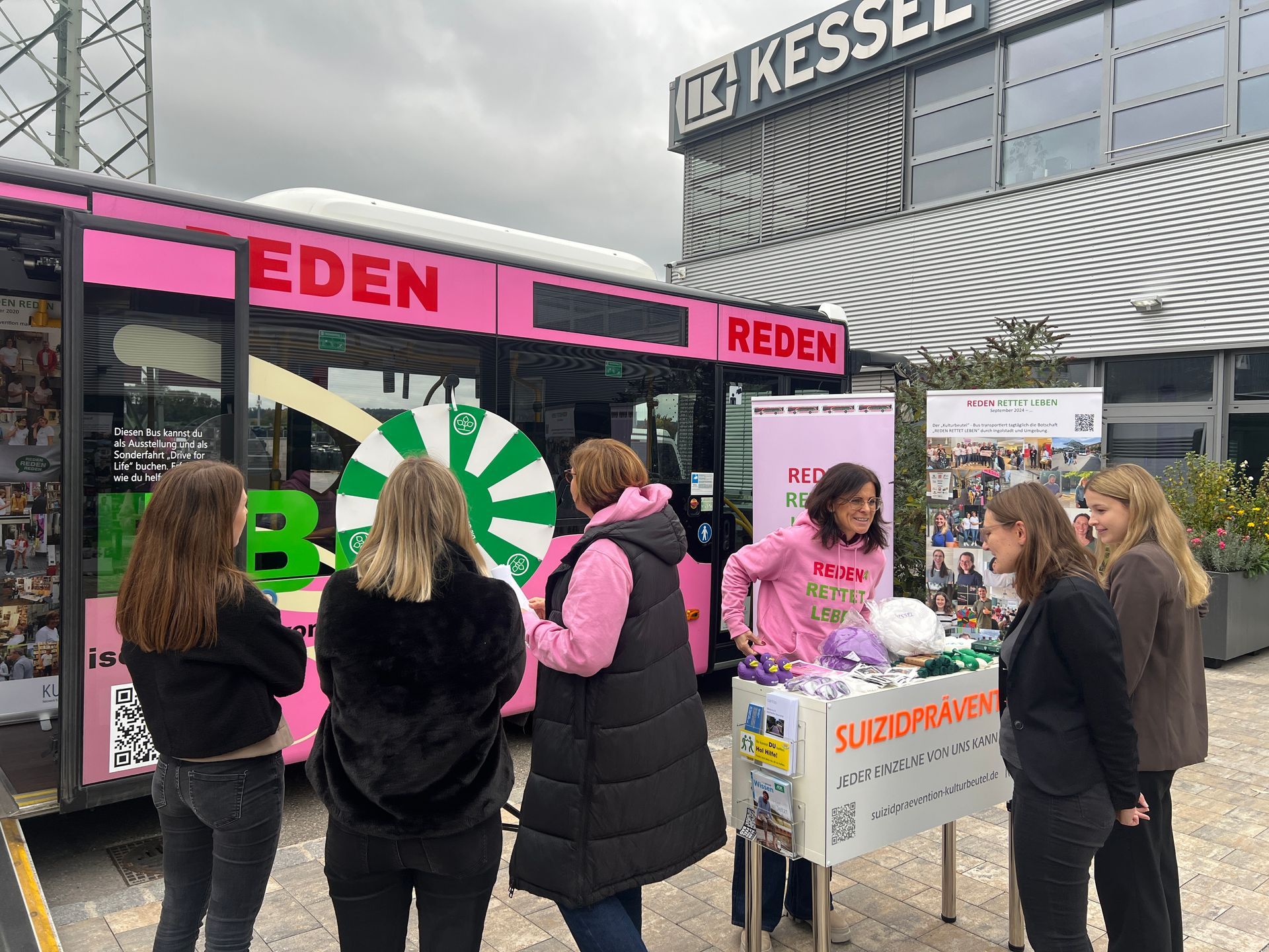 Am Montag, den 13. Oktober, war der Verein Kulturbeutel mit seinem Bus bei der Firma Kessel zu Gast. Er machte auf das wichtige Thema psychische Gesundheit und Suizidprävention aufmerksam. Mitarbeitende nutzten die Gelegenheit, am Glücksrad zu drehen und anschließend Fragen zu beantworten. Es war ein schöner Nachmittag mit vielen interessanten Gesprächen.