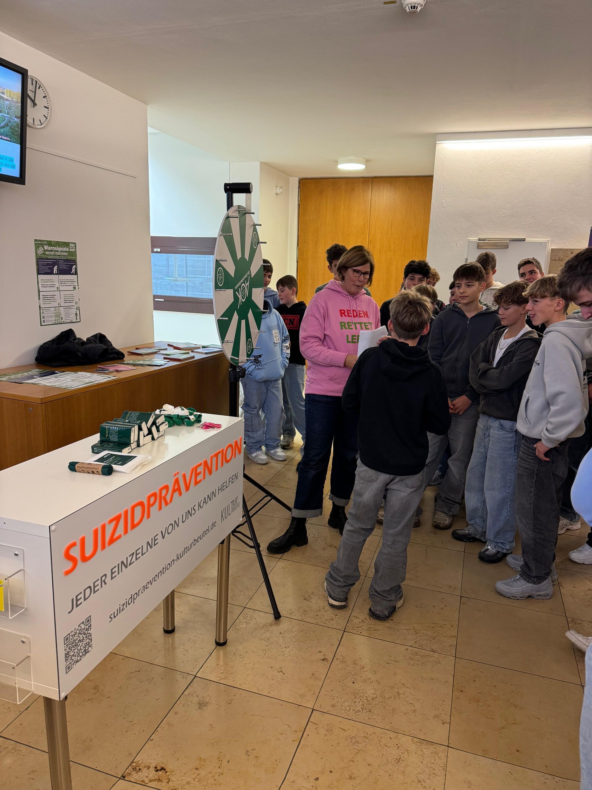Auf Anfrage von Jonas Schild (Jugendsozialarbeiter) und Martin Pohle (Schulpsychologe) gestalteten wir mit den "Kulturbeuteln" eine Aktion zur Suizidprävention. In der Pause standen wir mit einem Glücksrad auf dem Schulhof, an dem die Kinder Fragen beantworteten und dafür kleine Geschenke erhielten. Nach der Pause gab es zusätzlich eine Stunde Zeit für Austausch, Gespräche und ganz viel Glücksrad drehen. Insgesamt nahmen über 100 Kinder teil, zeigten großes Interesse und führten viele wertvolle Gespräche mit uns.